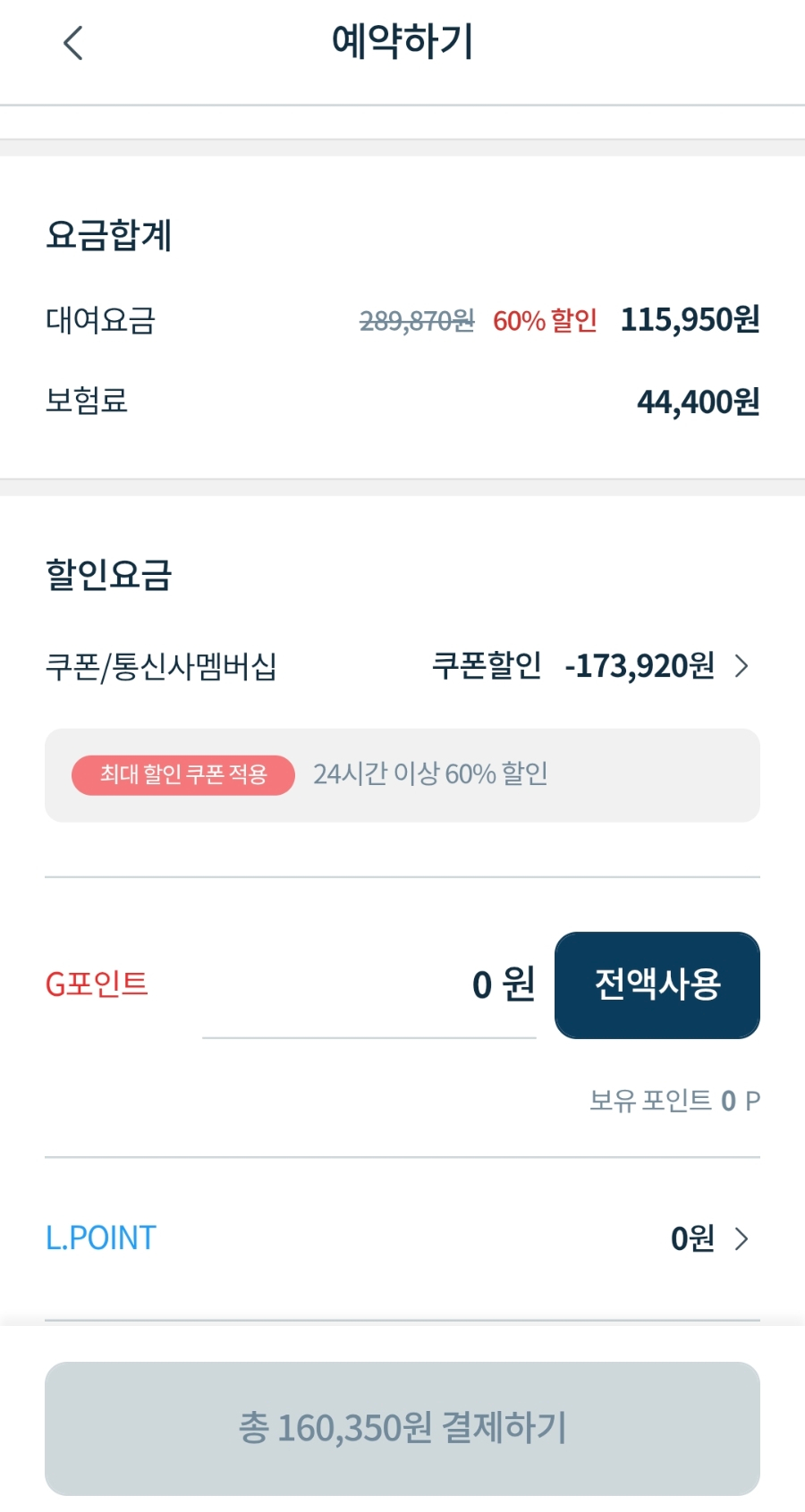 - 대여료(24h 이상 60% 할인 적용): 115,950원