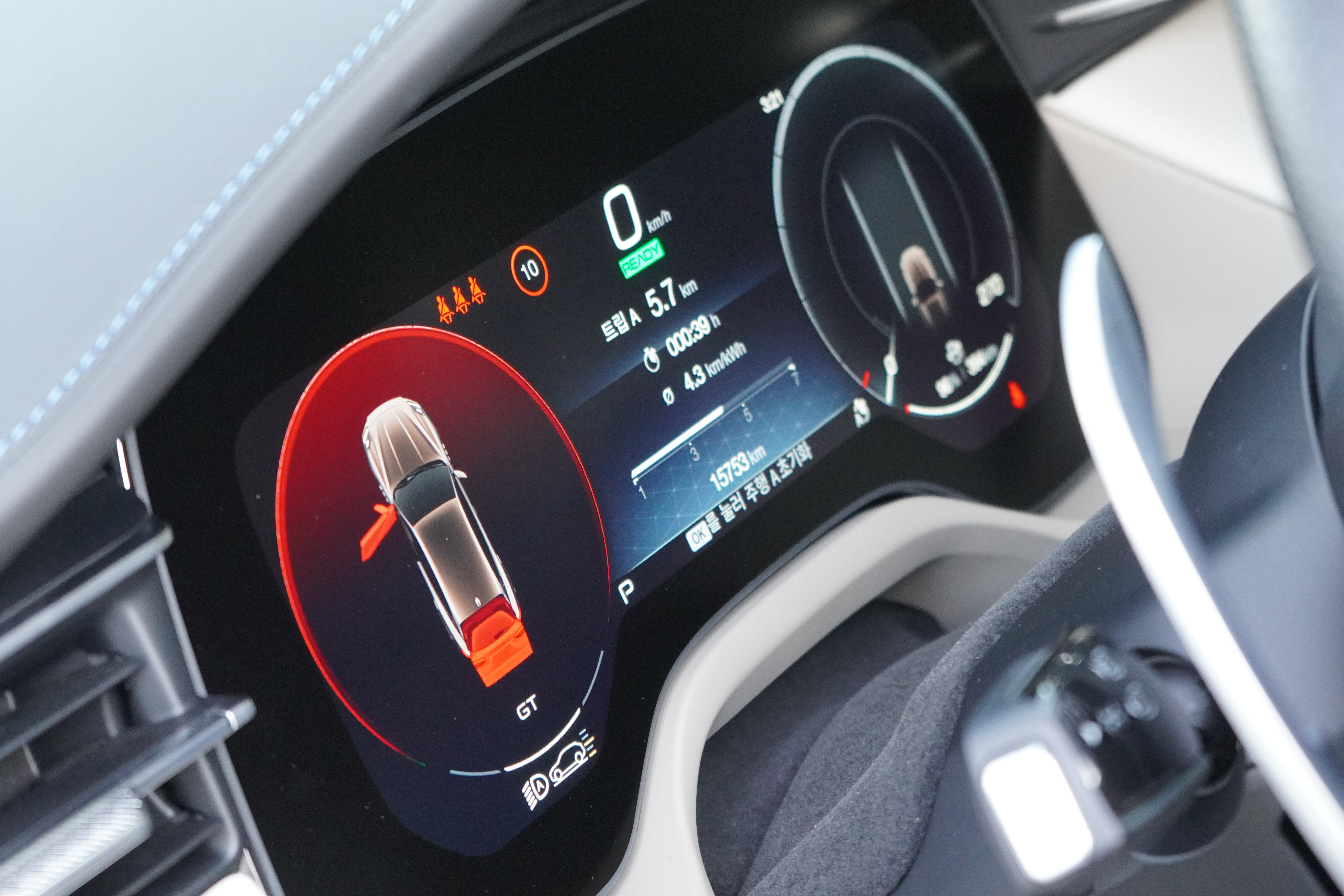 14방향 전동 스포츠 시트는 몸을 단단히 잡아주되 과하지 않고, 스티어링 휠 림 두께는 얇아 조작이 가볍습니다. 패들 시프트는 변속 대신 회생제동 단계를 조절하는 역할을 맡고 있어, 전기차임에도 주행 중 활용도가 높았습니다.