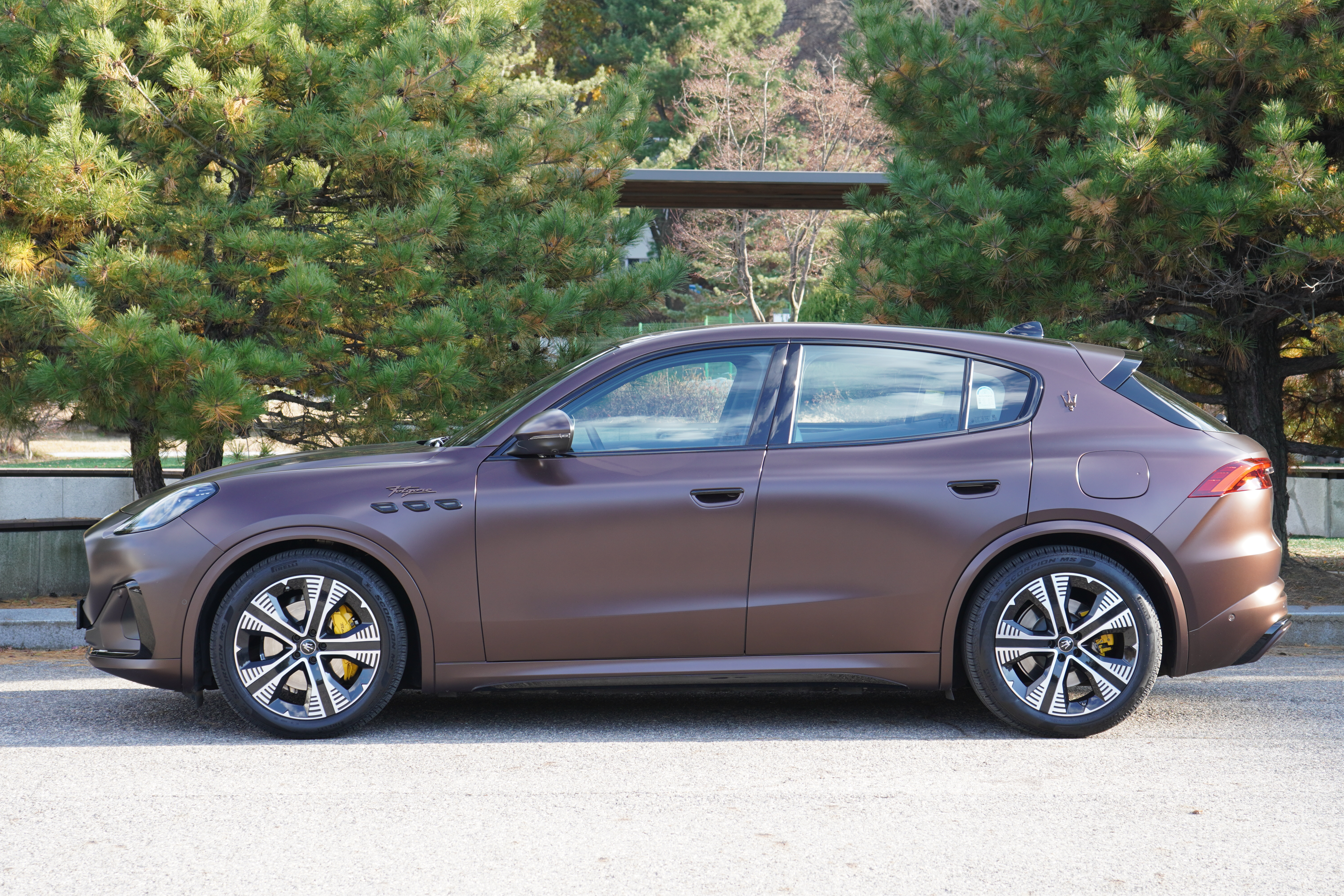 외관은 내연기관 그레칼레와 큰 틀에서 동일합니다. 전면부 일부는 공기저항을 줄이기 위해 막혀 있지만, 마세라티 특유의 세로형 그릴 패턴과 삼지창 엠블럼은 그대로 유지돼 멀리서 보면 전기차라는 사실이 쉽게 드러나지 않습니다.