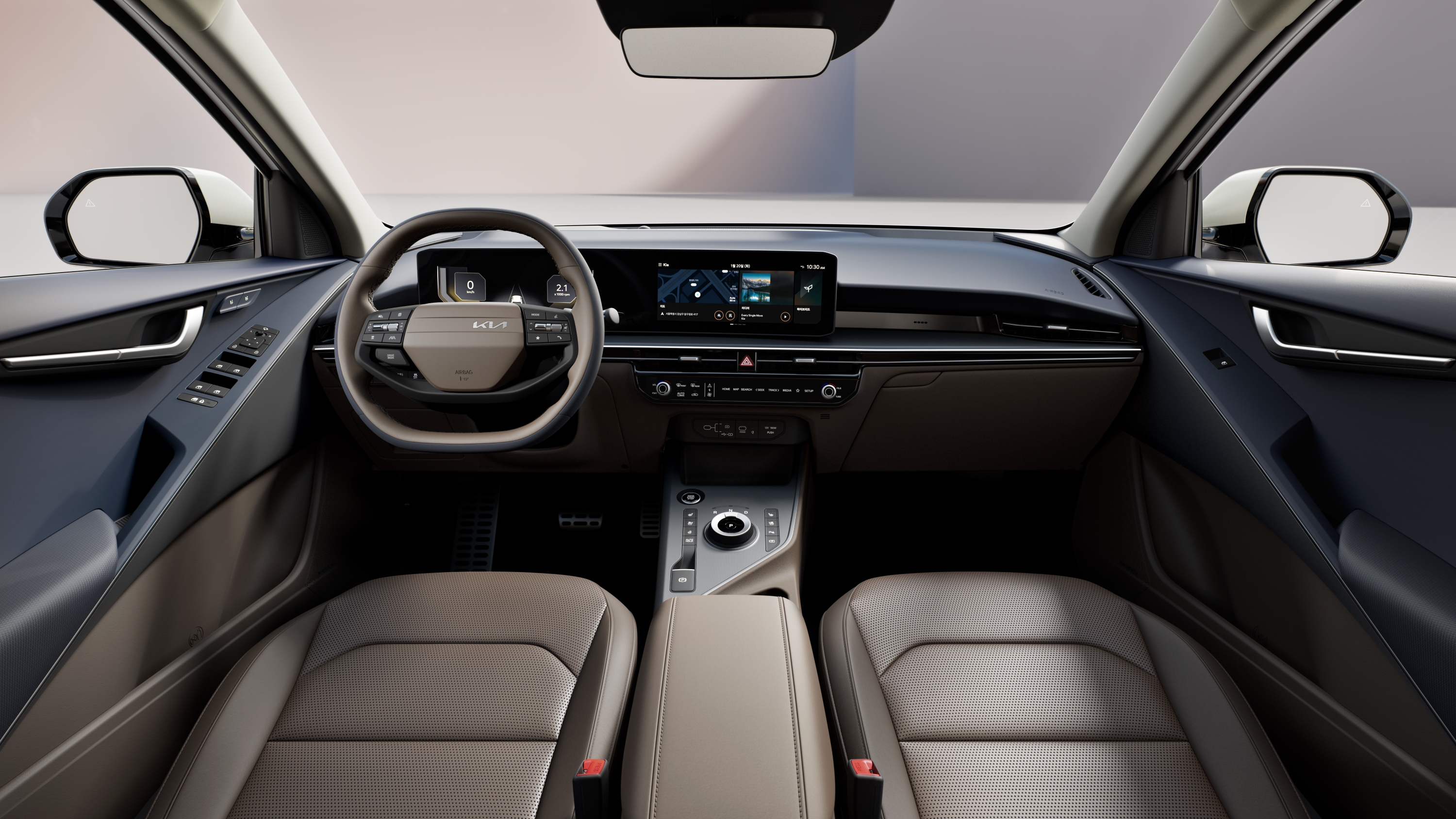 실내에서 가장 눈에 띄는 변화는 파노라믹 커브드 디스플레이다. 12.3인치 클러스터와 12.3인치 인포테인먼트 화면을 하나로 연결한 구성으로, 최근 기아의 최신 실내 디자인 흐름이 그대로 반영됐다. 수평적으로 길게 펼쳐진 대시보드는 체감 공간을 한층 넓어 보이게 만들고, 외관의 벨트라인과 실내 상단 라인이 이어지며 디자인 통일성도 높였다.