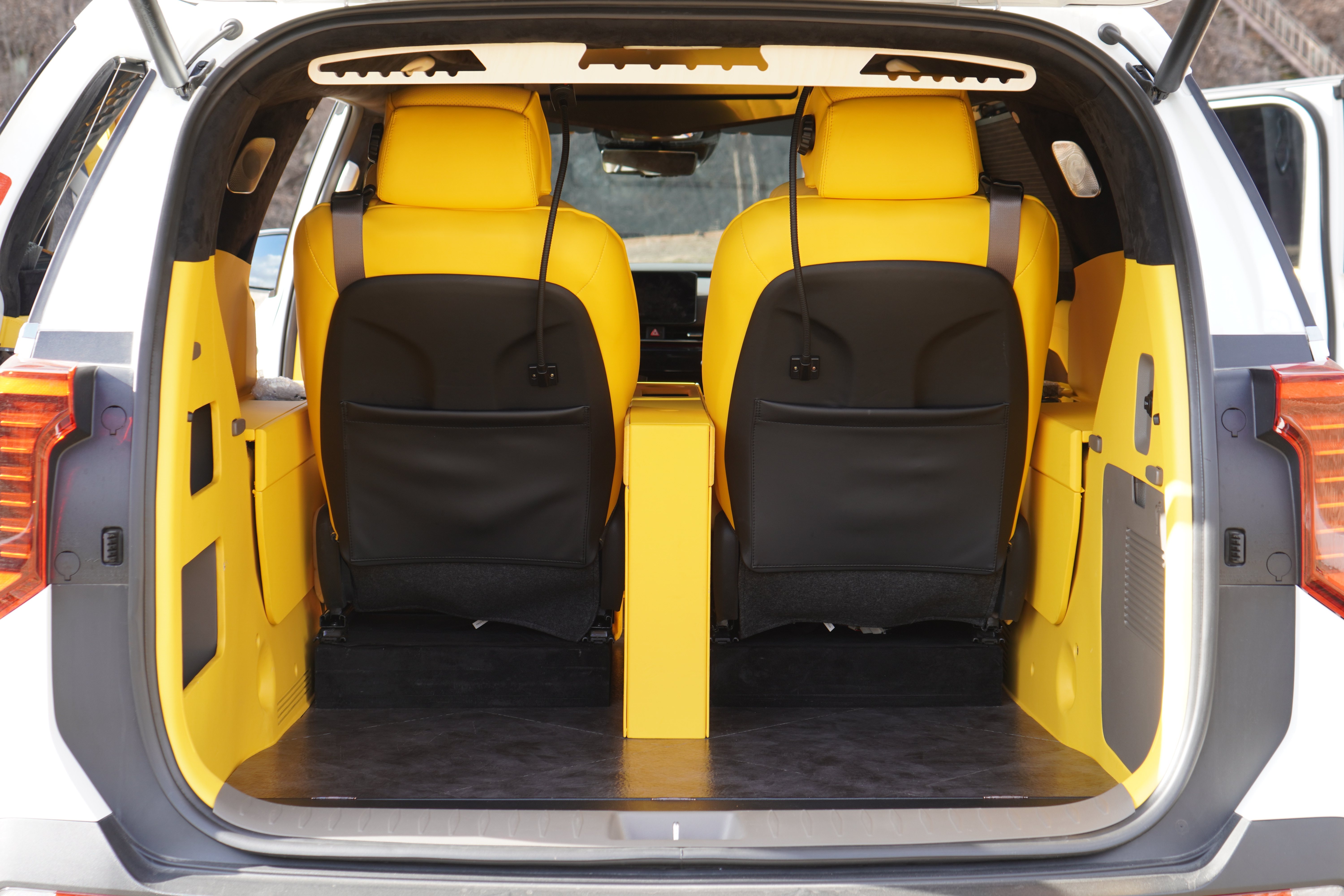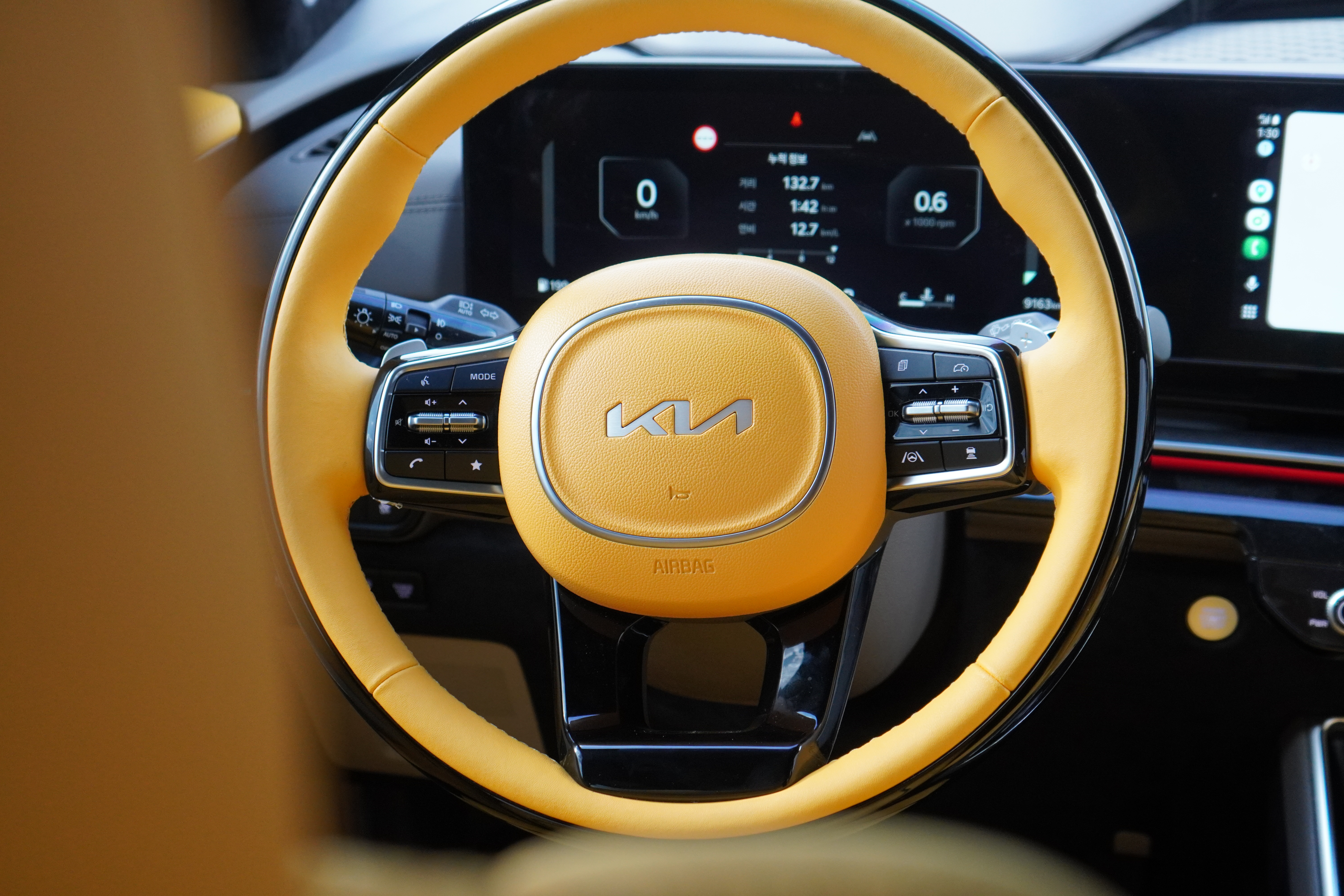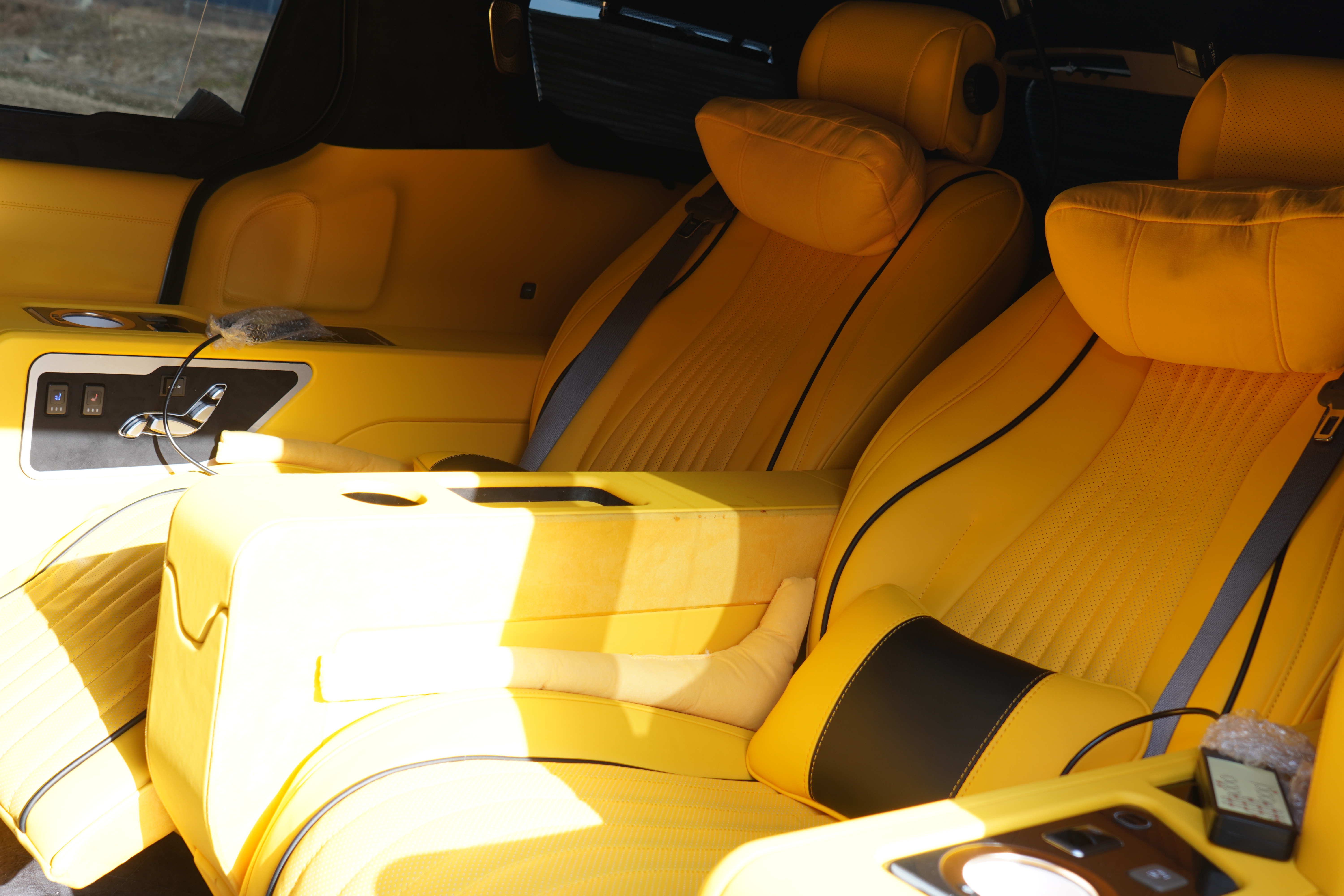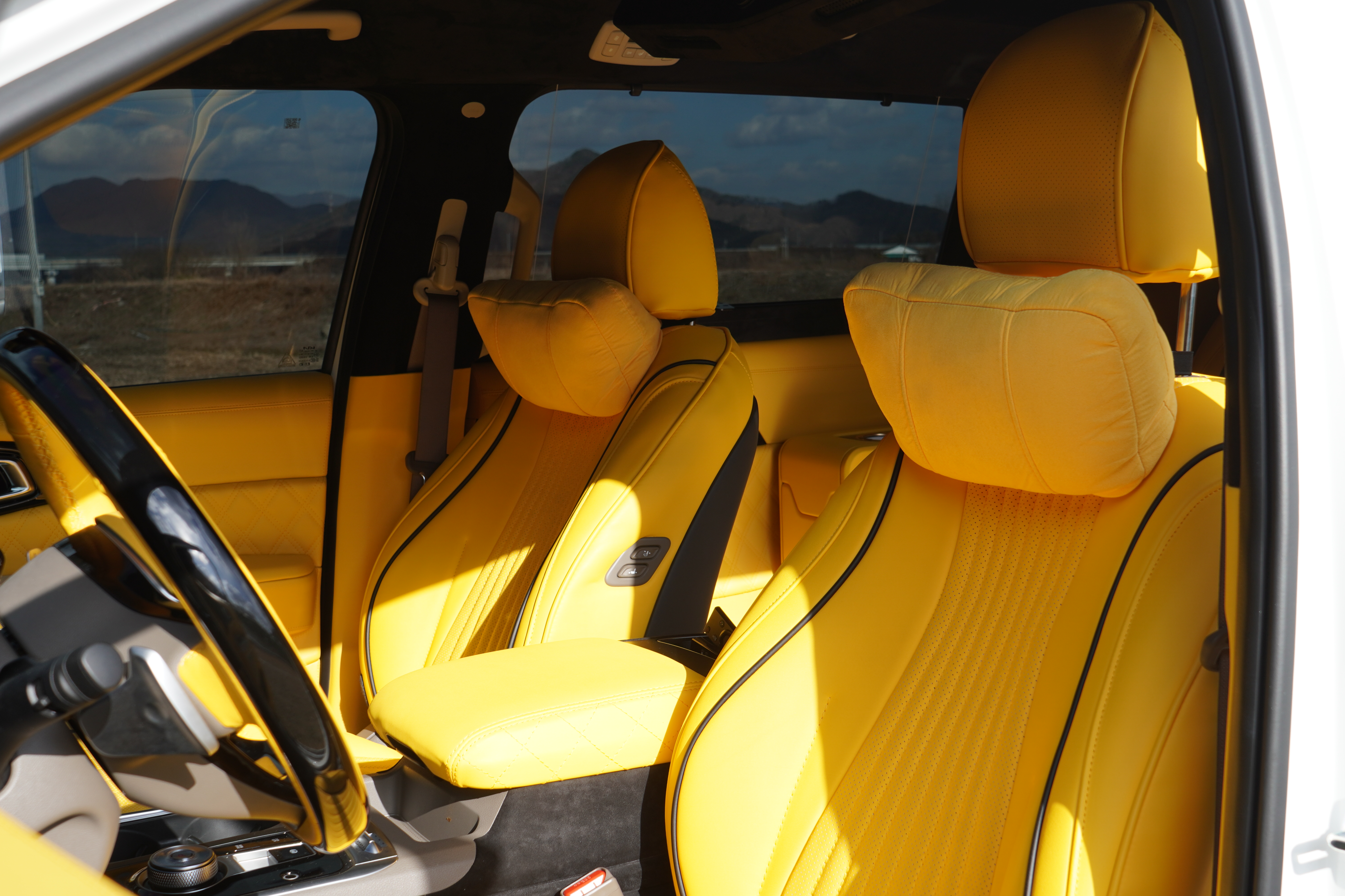 1열부터 남다릅니다. 우레탄이 있던 자리는 고급 가죽 트리밍으로 마감되었고, 옐로우 포인트가 들어간 D컷 스타일의 스티어링 휠은 그립감이 훌륭합니다. 특히 1열 시트까지 리무진 시트로 업그레이드되어 운전자(또는 수행기사)에게도 최상의 편안함을 제공합니다.