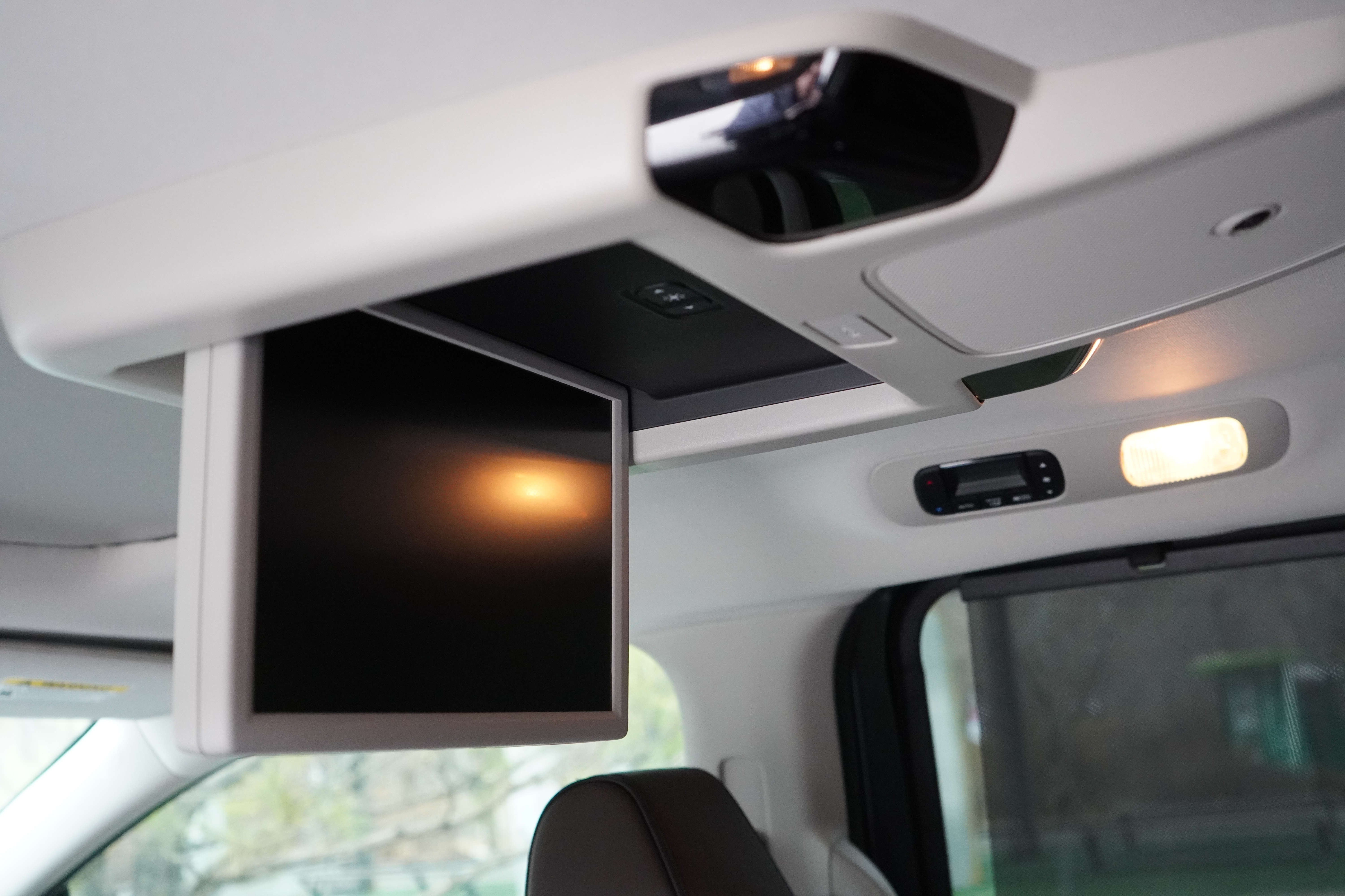 여기에 10.2인치 천장형 모니터는 아이들이 있는 집에서는 '치트키'와 같습니다. HDMI 단자를 통해 닌텐도 스위치 등을 연결할 수 있고, 무선 헤드폰이 제공되어 운전자는 조용히 운전에만 집중할 수 있습니다.