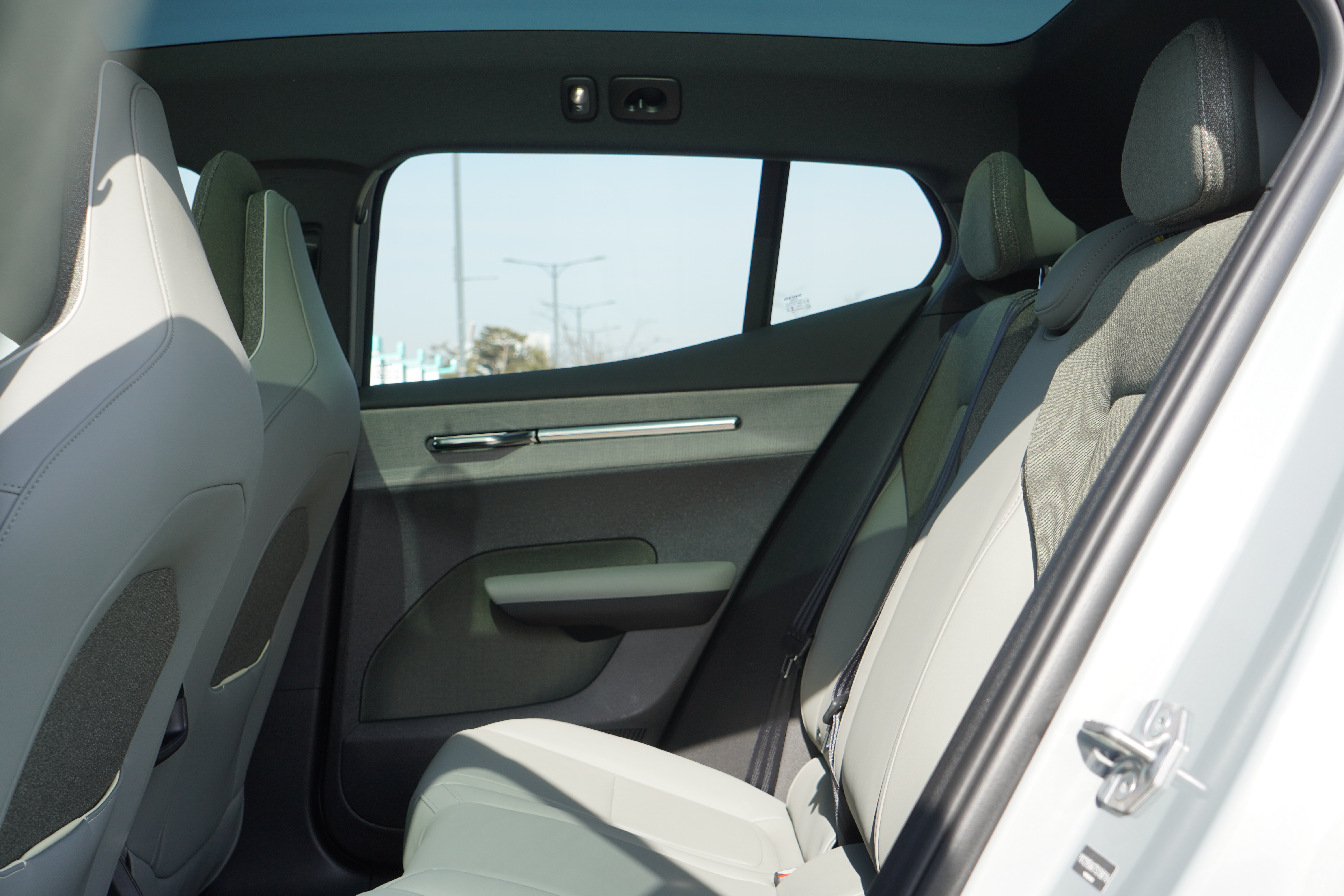 EX30 CC에는 파인(Pine) 룸 테마가 적용됩니다. 대시보드와 도어 트림을 감싼 소재는 플라스틱이 아니라, 실제 아마(Flax) 식물 줄기를 엮어서 만들었습니다. 만져보면 지푸라기 같은 거친 질감이 살아있어 마치 스웨덴 숲속의 오두막에 들어온 듯한 따뜻함을 줍니다.