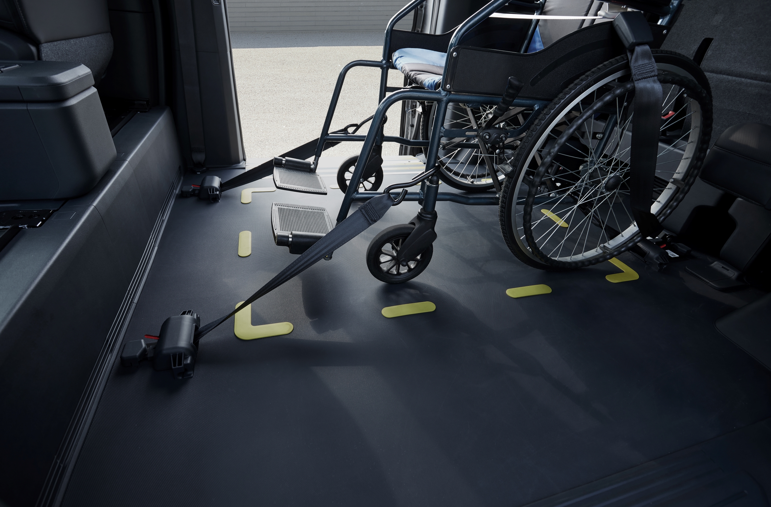 ① 측면 진입(Side Entry)과 풀 플랫(Full-Flat) PV5 WAV는 국내 최초로 측면 슬라이딩 도어를 통한 휠체어 탑승 방식을 구현했습니다. 이는 구동축이나 배기라인이 지나가지 않는 전기차 특유의 평평한 바닥(Full-Flat) 덕분에 가능했습니다. 인도(보도)에서 안전하게 바로 탑승할 수 있다는 점은 단순한 편의를 넘어 탑승자의 존엄과 안전을 지키는 설계입니다.