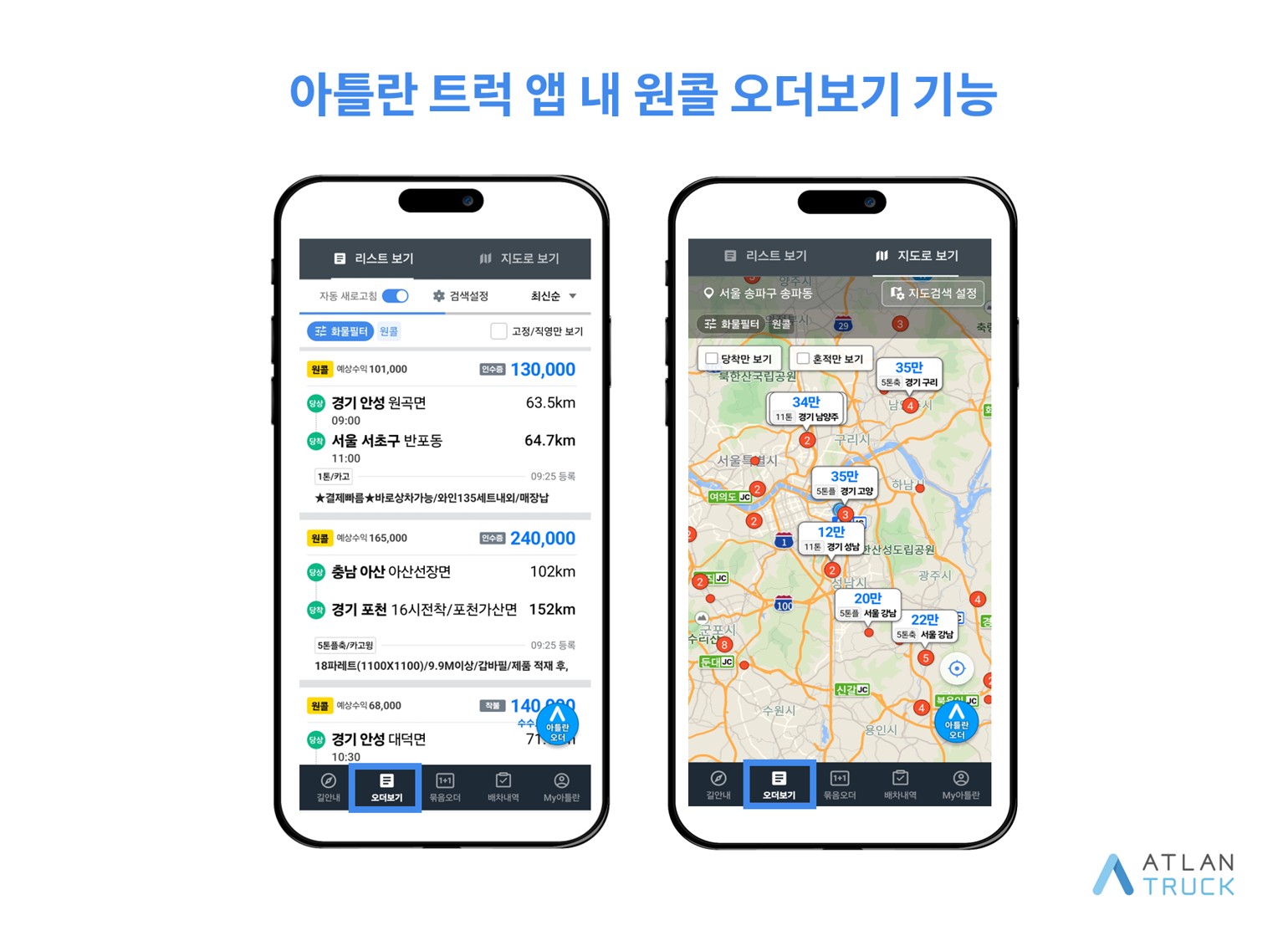 그런데 여기서 끝이 아닙니다. 아틀란 트럭은 단순히 길을 빠르게 알려주는 것을 넘어서서, 이제는 내 차량에 딱 맞는 돈 되는 짐을 제대로 고를 수 있도록 돕는 진정한 화물차 어플로 진화했습니다. 기사님들이 일감을 찾을 때 가장 많이들 접속하시는 원콜 서비스와 완전히 하나로 연동을 시켜버린 겁니다.
