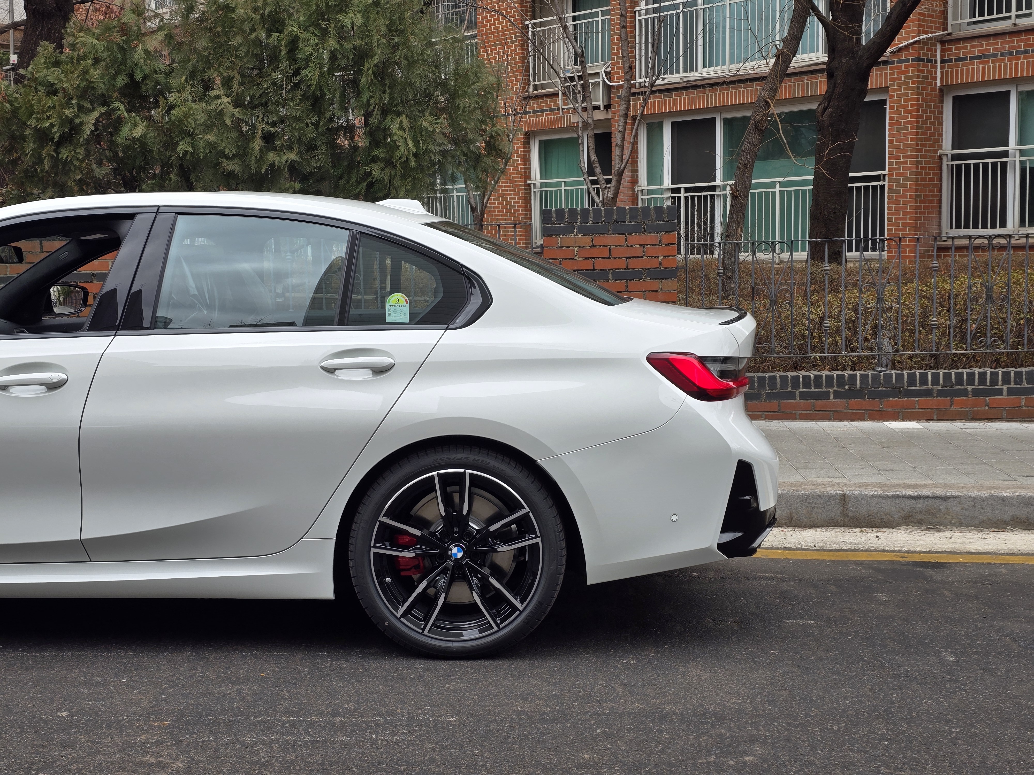 측면을 바라보면 휠하우스를 빈틈없이 꽉 채우는 19인치 알로이 휠과 그 안에서 강렬하게 존재감을 뽐내는 레드 캘리퍼가 달리기 성능에 대한 기대감을 한껏 고조시킵니다. 그리고 제가 정말 좋아하는 매력 포인트가 하나 있는데요, 바로 사이드미러 상단에 불쑥 솟아오른 에어핀입니다.